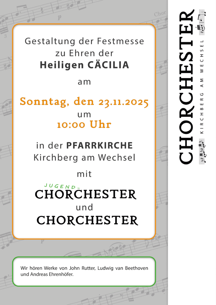 Anlässlich des Festes der Heiligen Cäcilia, der Patronin der Kirchenmusik, dürfen wir die Festmesse am 23.11.2025 in der Pfarrkirche Kirchberg am Wechsel gestalten.